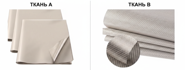 Отличие тканей: в бюджетной (ромбики) сетка реже, вихревые токи слабее — затухание падает на высоких частотах. В премиум (гладкая) плетение плотнее, покрытие равномернее — токи сильнее, экранирование стабильнее.